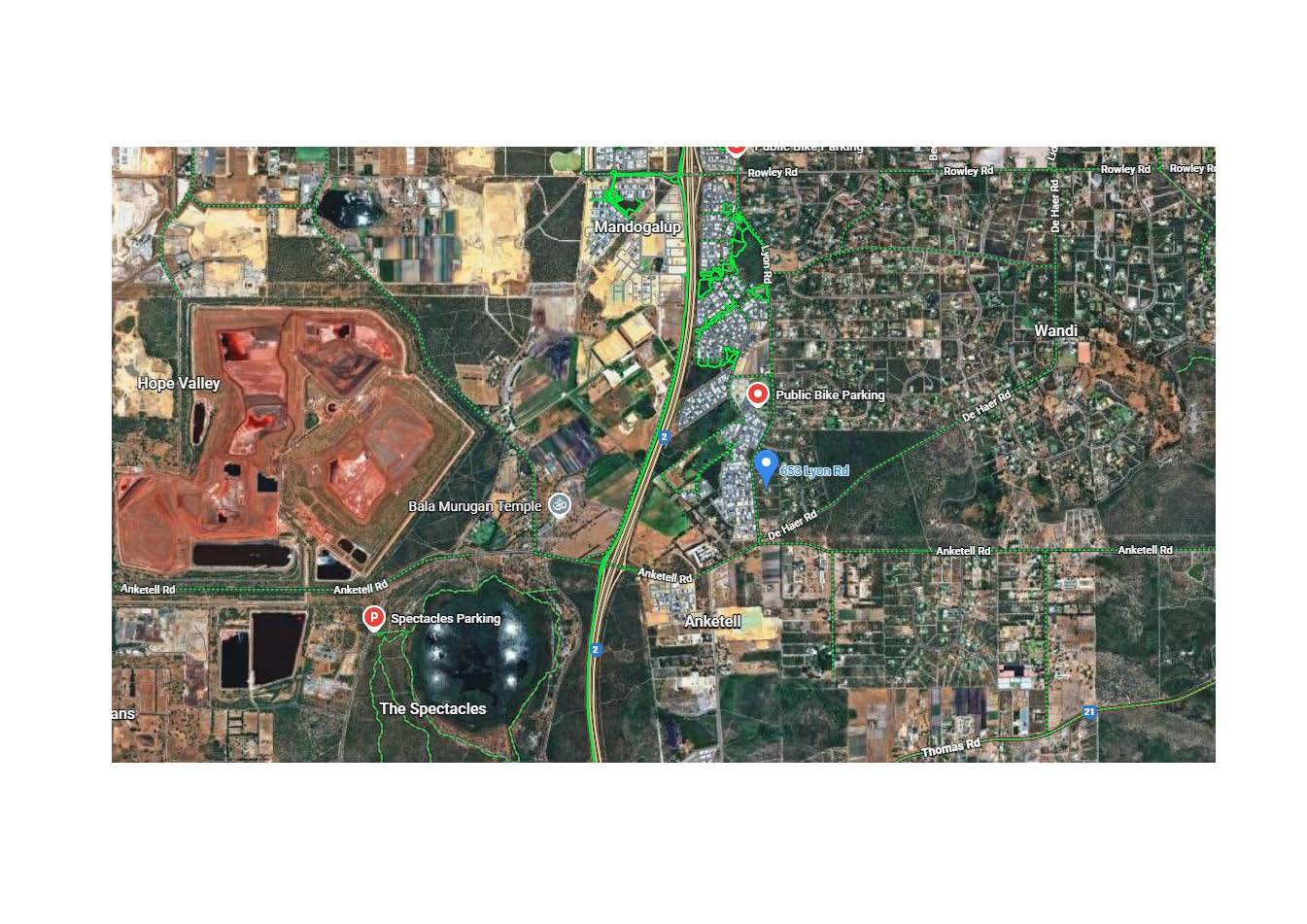 The immediate surrounding location includes Future Wandi District Shopping Precinct on Anketell Road, Public open space reserves, Existing Freeway access (1 minute away), Wandi Primary School in Honeywood, Wandi District Playing Fields, Hammond Park Catholic Primary School, Aubin Grove Railway Station, Kwinana Hub Shopping Centre, Cockburn Central Gateway Shopping Centre, IGA at Hammond Park, Aubin Grove Medical Centre, Jupiter Health and Medical Centre Hammond Park, Fiona Stanley Hospital, Quarry Tavern and Brasserie at Hammond Park, Marri Park Golf Course and Tavern, The Spectacles nature reserve.